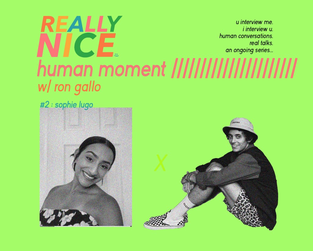 hi welcome to REALLY NICE™️ human moment series. this project started with me in a moment of self-doubt going on twitter and posting “who wants to interview each other?” with the goal being to find random people that may not normally do interviews and just have a conversation, connect with people on a real level during a time when i can not in person. i learned a lot from just these first few – that all of these people had 1000x better interview questions than any music journalist i’ve ever talked to, that they were open and down to get deeply personal and share their stories which revealed we all share a similar internal experience and lastly, they all gave me a lot of perspective on the impact of what i do can have on others. which i rarely get the chance to know. and vice versa. thank you for reading and i hope that these conversations make anyone out there feel less alone, comforted or empowered by seeing themself in someone else.